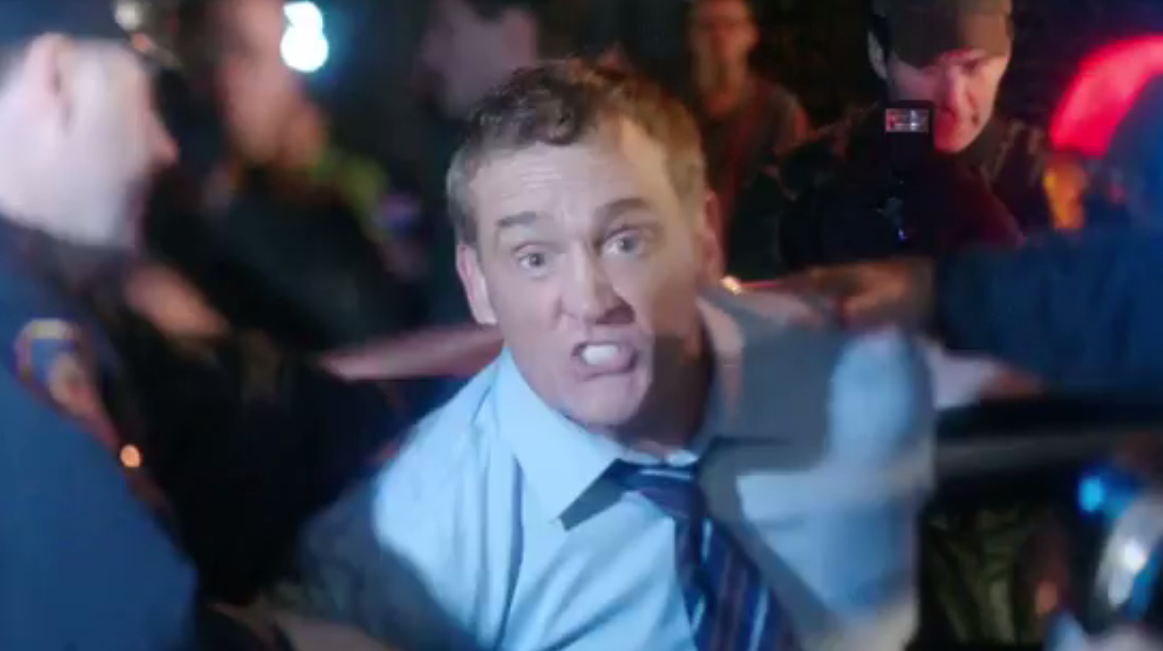 As he goes his mind wanders back to the night of his mom's murder. And then he hits a barrier. He ends up breaking his arm.